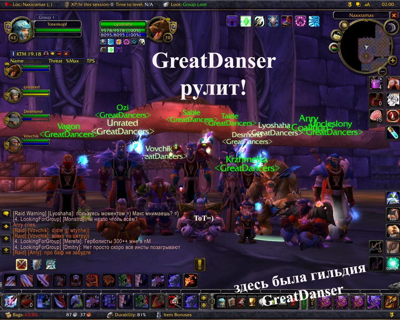 | Это самый сплочённый гилд-рейд, который я когда-либо видел за все 2-3 года игры в вов... Всем отдельный респект, всем отдельное спасибо за ахрененно проведённое время, мы лучшие!